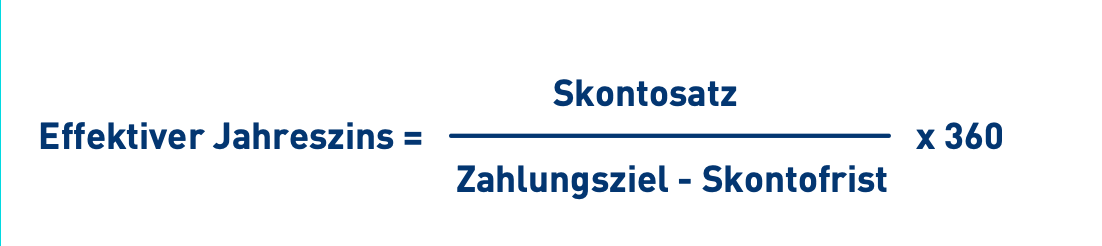 Somit ergibt sich ein impliziter Zins von 3% auf die Zeitdifferenz von 20 Tagen, der bei Nichtnutzung von Skonto, also bei Ausnutzung des Zahlungszieles, an den Lieferanten gezahlt wird. Rechnet man die Zeitspanne von 20 Tagen aufs Jahr hoch, so erhält man den effektiven Jahreszins nach folgender Formel: